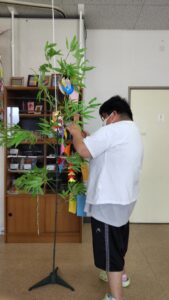 「世界平和、家族の幸せ」、「健康第一」、「コロナが早く終息して自由に買い物とか外出ができるようになりますように」、「さをり織りがもっと上手に織れるようになりますように」、「お仕事頑張りたい」と自分の仕事や新型コロナウイルス終息後の将来への希望を反映した願いごとも多数見受けられました。七夕は1年に1度だけ「おりひめ」と「ひこぼし」が天の川の上でデートをする日といわれ、この日にちなんで願い事を書いた短冊を笹の葉につるし、おりひめ星に上達を願うとされています。みんなの願いは、天の川へ届けられました。おりひめさんとひこぼしさん、願い事を聞いてくれましたか?叶いますように・・・。